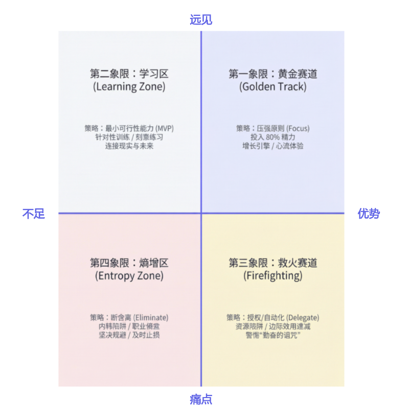 我们常常因为恐惧而不敢放弃那些“食之无味,弃之可惜”的技能,或者因为从众心理而去追逐当下的热门风口。🌪️ 但优势罗盘提醒我们:资源是有限的。⏳ 如果你把时间花在修补那些无关紧要的短板上(第二象限),或者消耗在解决当下的琐事中(第三象限),你就永远无法在你的核心优势区建立起真正的壁垒。🏰